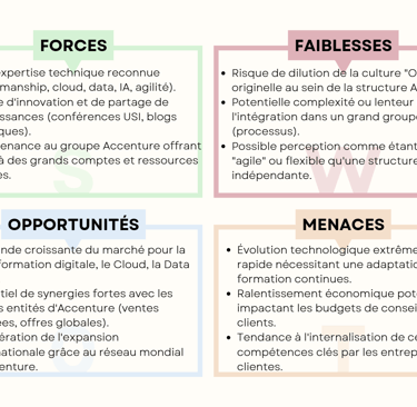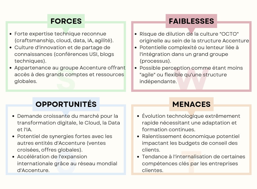 Les orientations stratégiques liées à l'expertise d'Octo Technology sont désormais intégrées à la stratégie d'Accenture Technology. L'accent est mis sur la synergie des expertises, l'accélération de la transformation numérique des clients à grande échelle, le maintien de l'innovation dans les domaines clés hérités d'Octo (IA, Data, Cloud, Cybersécurité) et le développement des talents au sein du groupe Accenture. L'objectif est de renforcer la position d'Accenture en Europe et mondialement grâce à cette expertise combinée.