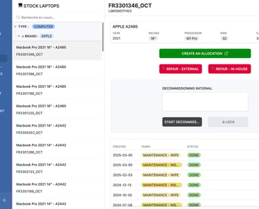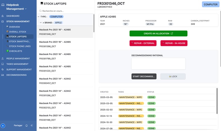 Dans cette mission mon travail consiste à gérer les entrées et sorties du matériel dans le stock que ce soit des ordinateurs, chargeurs ou autre. Je m'occupe aussi de la réception et de l'enregistrement des appareils (PC et MAC).